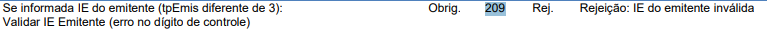 emitente estiver inválida, o sistema retornará a Rejeição 209.