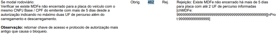 carregamento e descarregamento, o sistema retornará a rejeição 462.