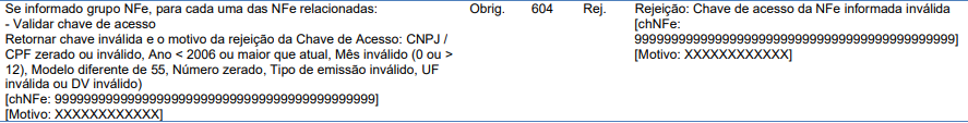 chave de acesso inválida, o sistema retornará a Rejeição 604.