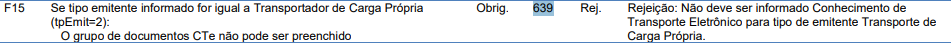 Ao emitir um MDF-e em que o transporte é de carga própria e for informado um CT-e, a SEFAZ retornará a Rejeição 639.