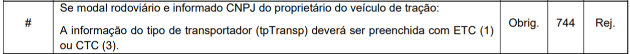 Rejeição 744, é necessário alterar o Tipo de Transportador para