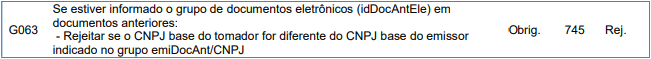 rejeição ocorre quando há divergência entre a tag emiDocAnt (emitente do