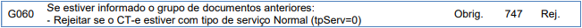 rejeição ocorre quando um CT-e é emitido com Tipo de Serviço Normal (tpServ =